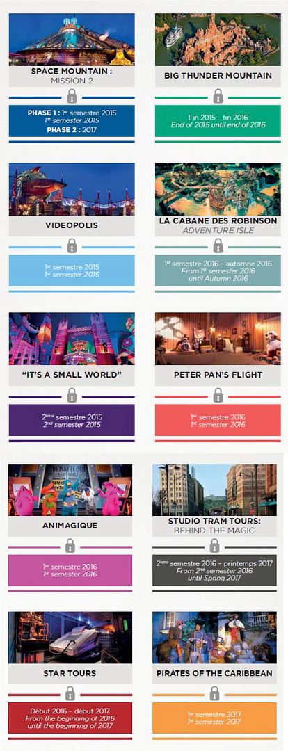 As you've read in one of my last updates translated from an ED92 report Frontierland BTM and Rivers of the Far-West will enter in renovation mode at the end of the year. A few days after ED92, and although not announced officially, we had from DLP the confirmation dates of all renovations to come, something you can read in my previous article HERE if you've missed it. But here below is the picture which was in it with all the refurb dates.