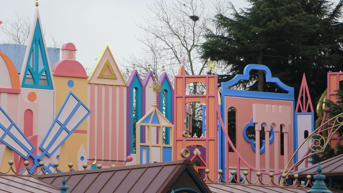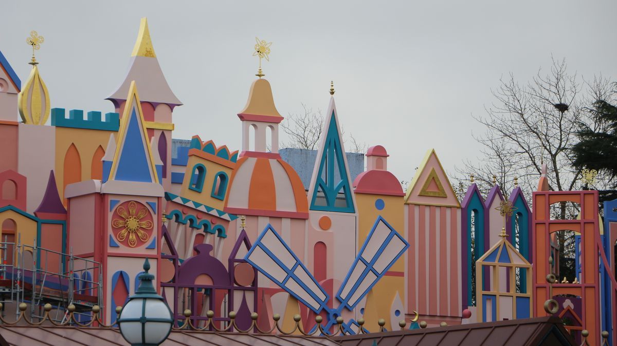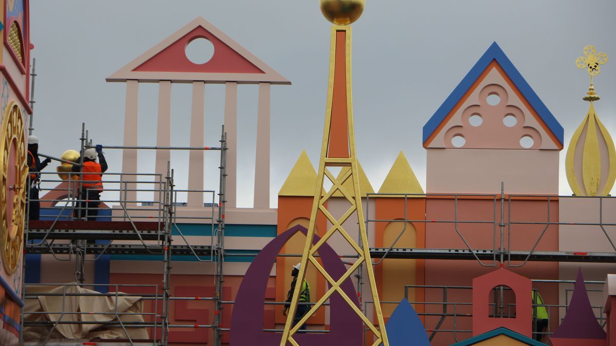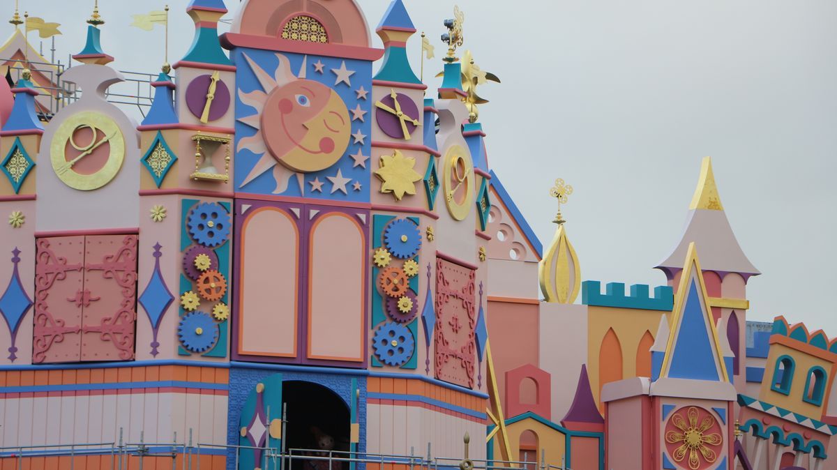 In Fantasyland, more than half of It's a Small World facade, repainted with new colors, is now visible. The attraction will reopen on December 19!