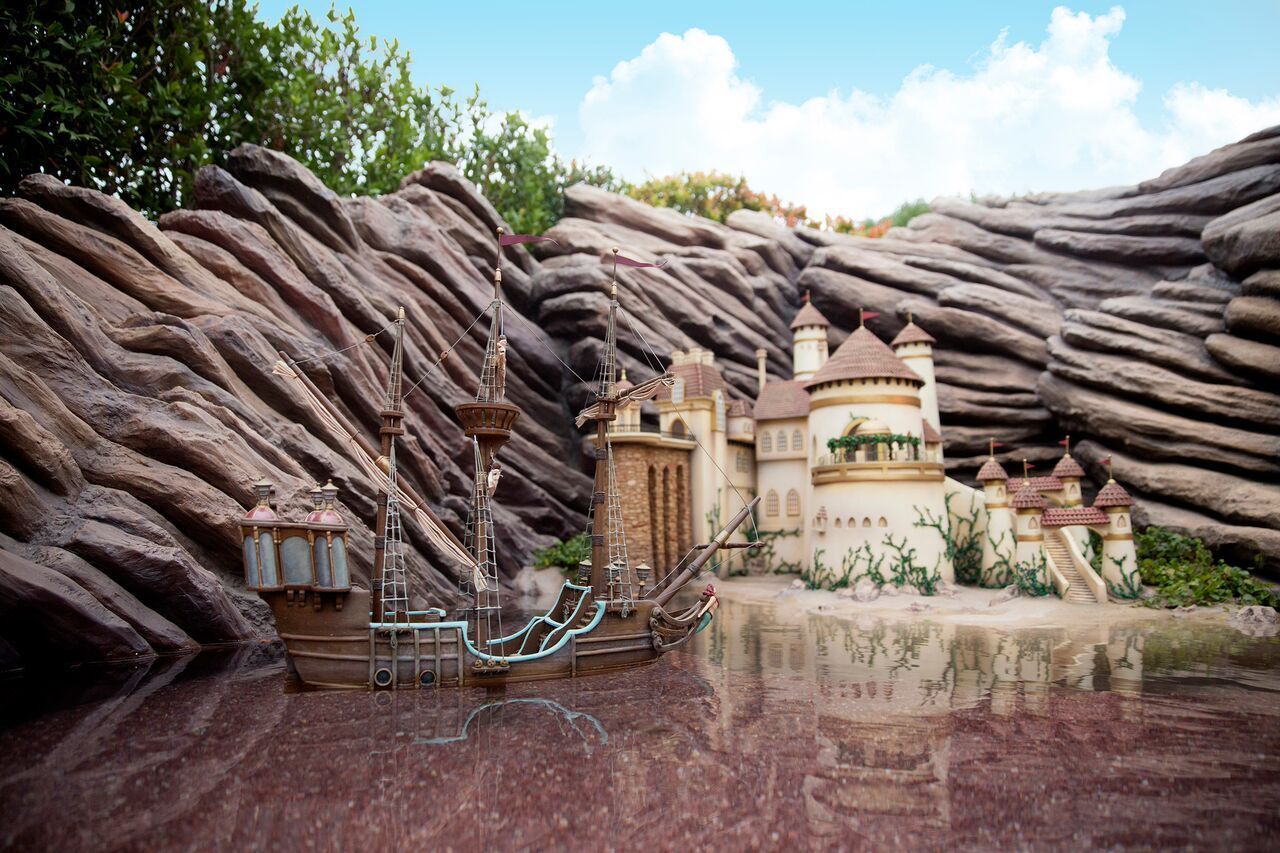 Five scenes of Disney’s classic Princess stories – Snow White and the Seven Dwarfs,” “Cinderella,” “The Little Mermaid,” “Beauty and the Beast” and “Tangled” awaits the visitors, plus a meet and greet with Tinkerbell at Pixie Hollow. For each scene there is a kind of "Story Book Land" miniature decor, plus an animated scene. Let's start with the one for Beauty and the Beast with Beast Castle upon its rock and Belle and the Beast dancing inside the castle.