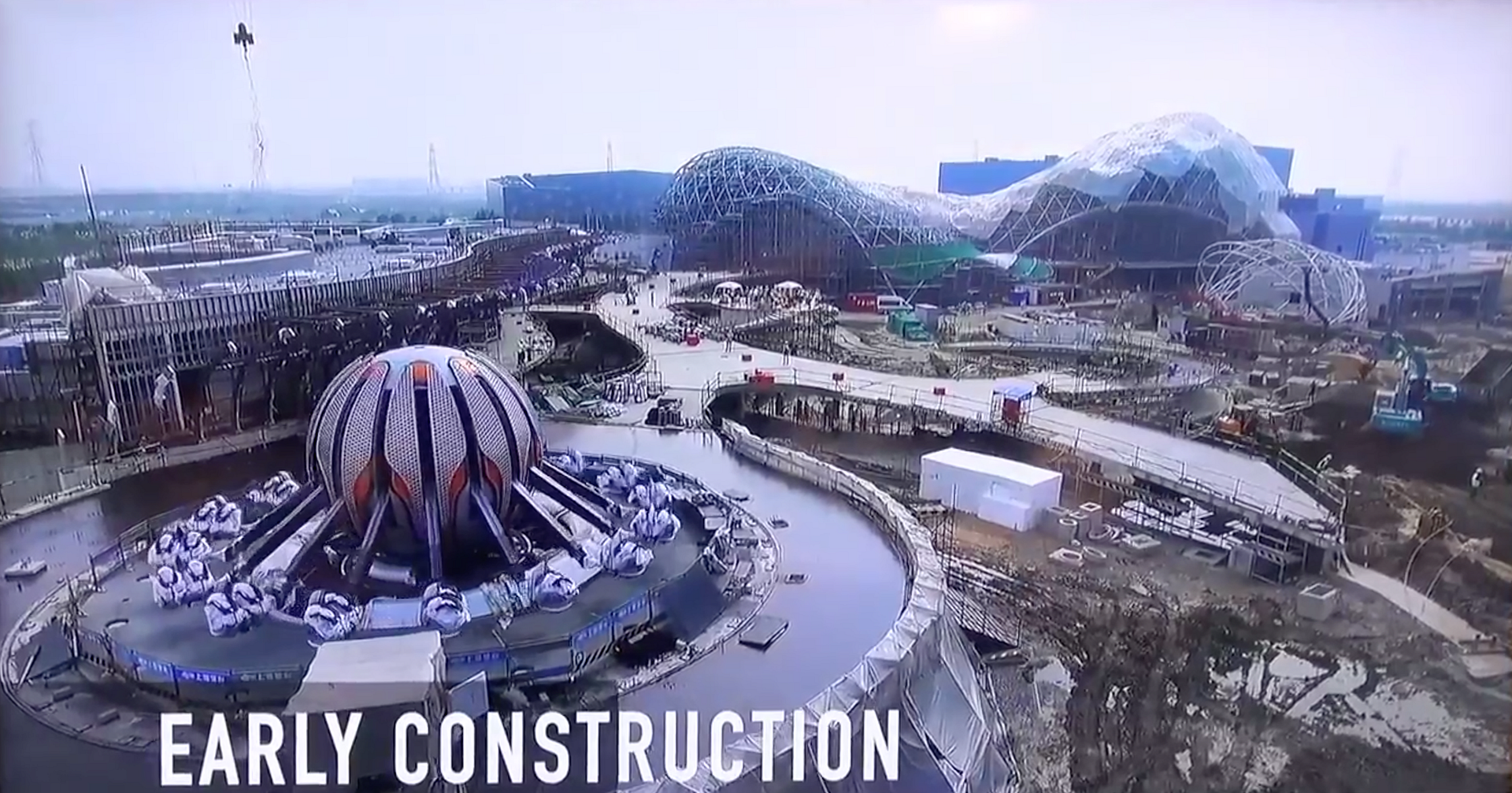 Interesting picture of the Tron coaster track not yet surrounded by the walls and ceiling of the show building.