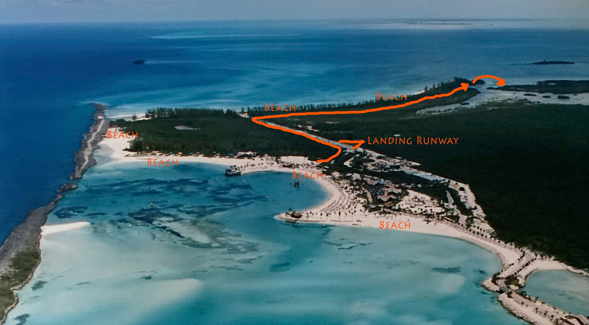 And then i had the good idea to rent a bicycle, something you could do at that time to "explore" the island - or at least to explore the part of the island that Disney is ready to let you explore. If you do this, which i recommend, you'll find easily a landing runway located behind the beach, and at the end you'll arrive to another "official" beach located on the island west coast. Now, there is a path on the right going all along the beach and if you take this path you'll arrive at a dead end as right after there is the sea. But right in front, at 20 - 30 meters the island continues and i remember thinking "that looks like what i'm looking for!". As i'm a quite good swimmer i decided to swim to the other side and, boy, there it was paradise! Nobody, a real natural beach as it exist normally before corporate lawyers decide to remove everything, nothing artificial, and fishes in the sea! You can walk even a bit more and find easily a place where you'll feel being alone in the world, far away from everything, exactly the feeling you should have on this kind of island. I've indicated for you the spot and how to reach it on the picture below.