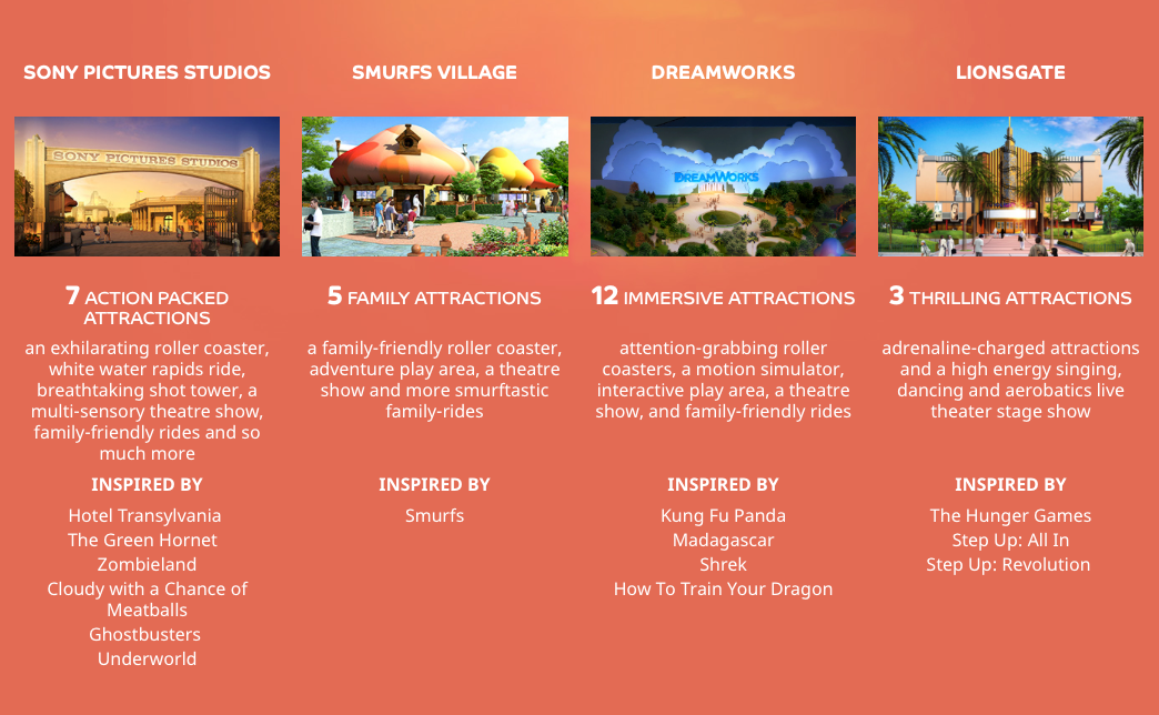 DreamWorks Animation, Sony Pictures and Lionsgate will have licensed rides in the park with films like The Hunger Games, Ghostbusters, Hotel Transylvania, The Smurfs, Zombieland, Shrek and more, see the list on the screen capture below. Attractions will include rollercoasters, multimedia theatre and a massive water ride which will use 793,000 gallons of water.