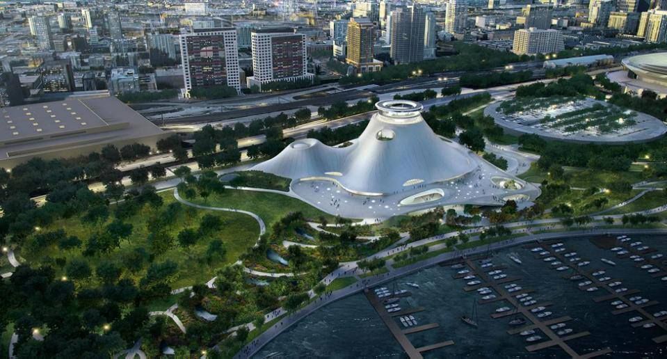 Nearly one year after initial designs by China's Ma Yansong were unveiled to the public, refinements to the George Lucas Museum of Narrative Art planned for a lakefront site in Chicago have been released. The site will be located between Soldier Field and McCormick Place and is currently a parking lot, When MAD Architects' design was unveiled last year happened some controversy about its size and alien form. Actually it looks a bit like Imagineer John Hench early concepts for Disneyland Space Mountain, but considering that the museum will include rare memorabilia pieces from Star Wars, the "space" style of the architecture is almost logical!