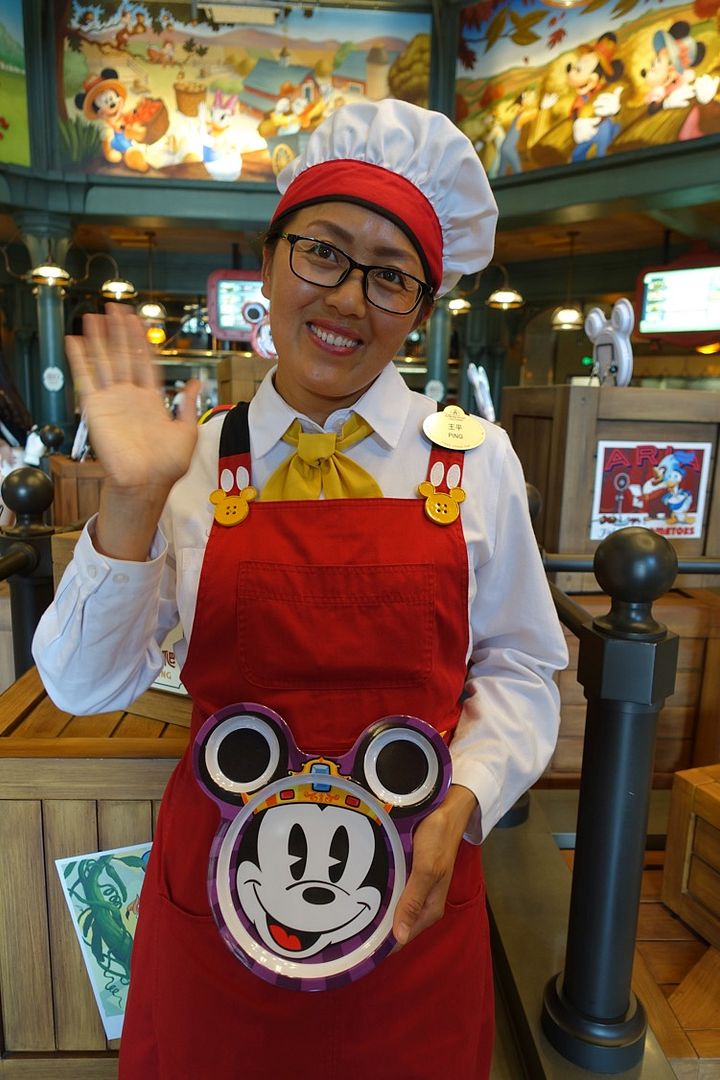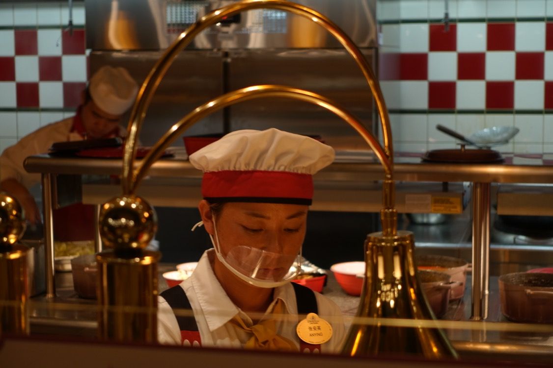 First time that i see someone working in a Disney restaurant with this transparent thing in front of the mouth obviously here for healthy reasons, but may be it's common in China?