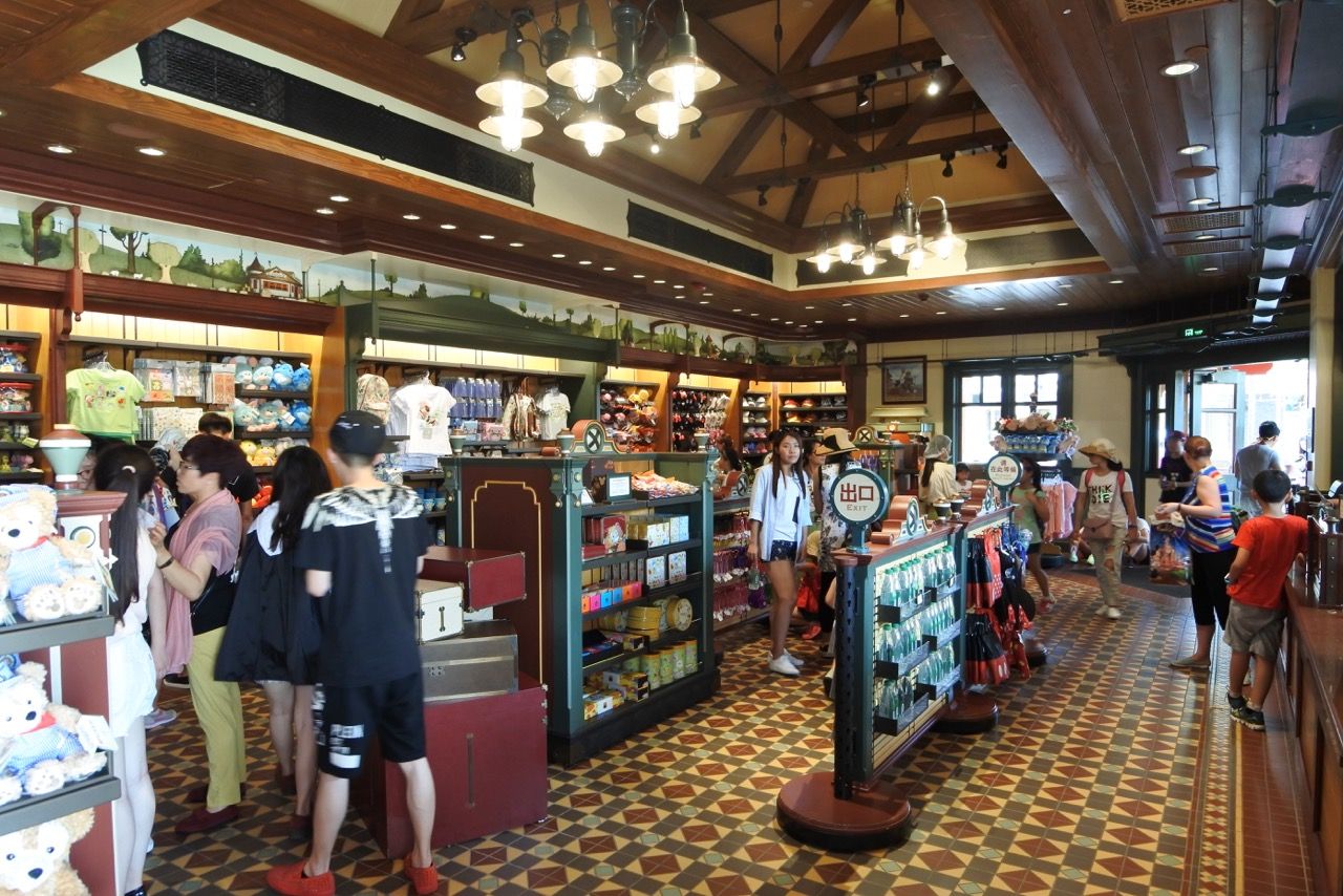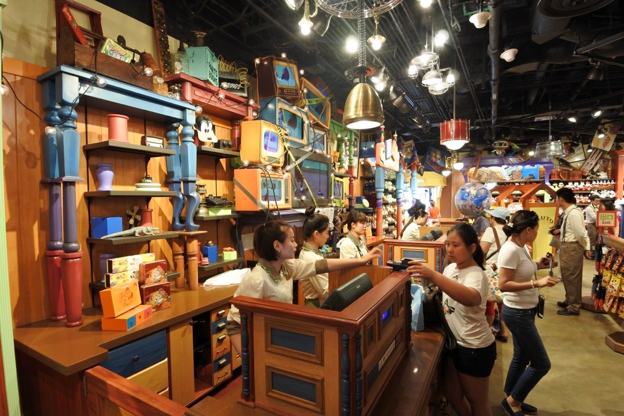 Let's go inside "Avenue M Arcade" which is here a bit like the Emporium in others parks. Avenue M Arcade feature the largest selection of gifts and collectibles inside the theme park, with items exclusively designed for Shanghai Disney Resort. It offer to SDL guests a selection of apparel and accessories, gifts, home décor and jewelry. The Arcade’s specially designed façade honors its most famous residents, who are represented as universal virtues on mosaic panels: Mickey Mouse (hospitality), Minnie Mouse with Figaro the cat (compassion), Goofy (optimism), Donald Duck (worldly), Daisy Duck (friendliness), Pluto and Fifi (generosity) and Chip & Dale(friendship). Even the checkout area is themed, as the First Bank of Scrooge McDuck."