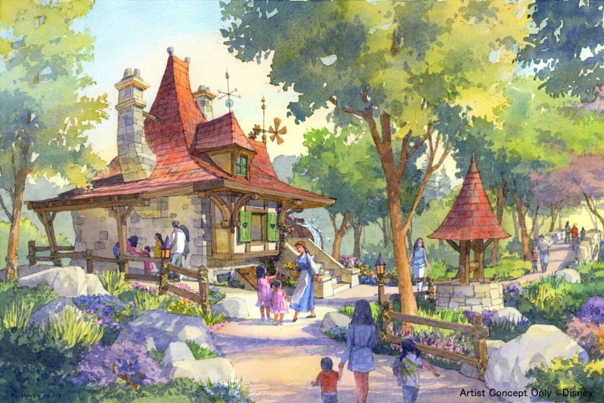 Above, an overall view and below New WDI artworks of the Beauty and the Beast village.