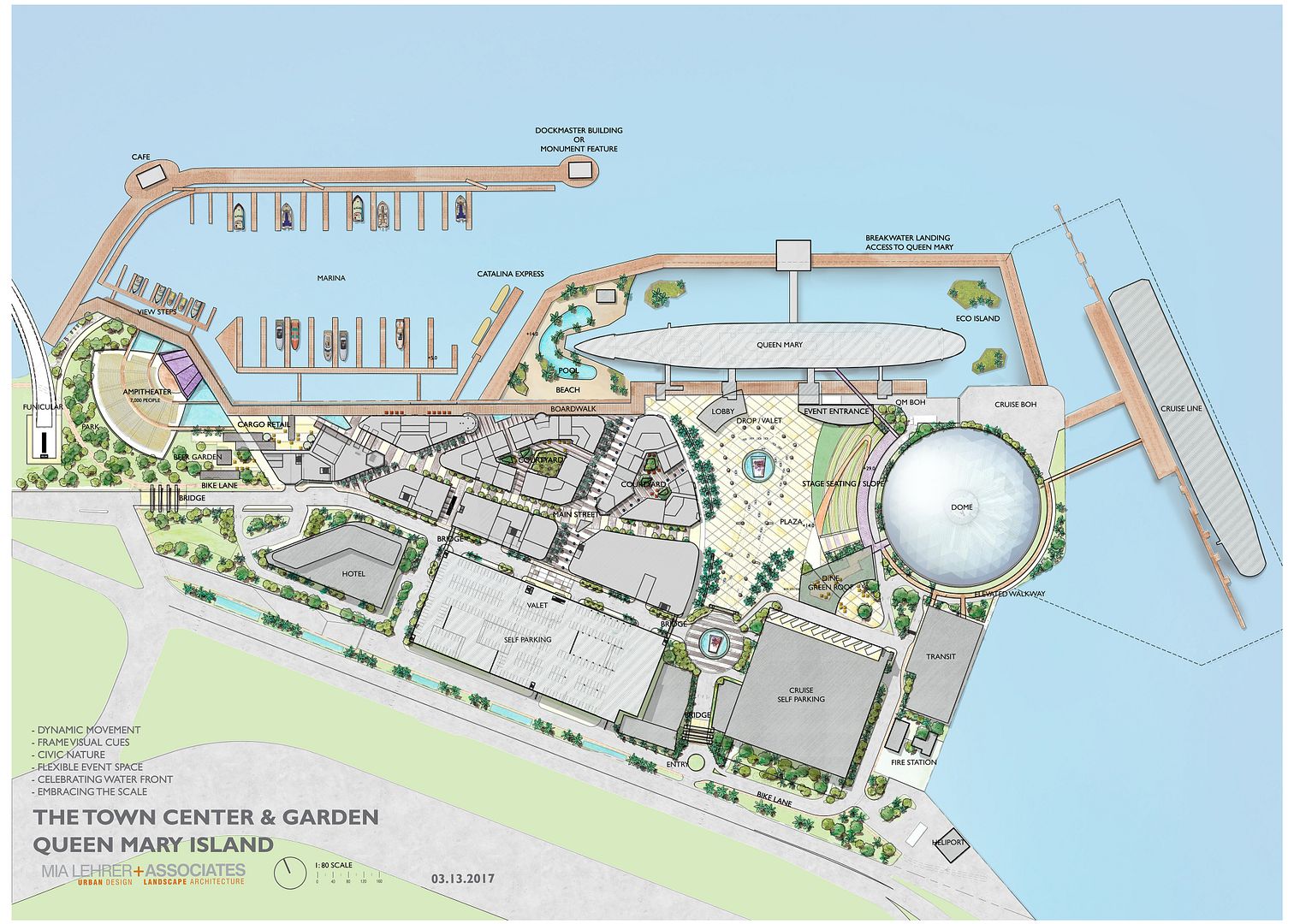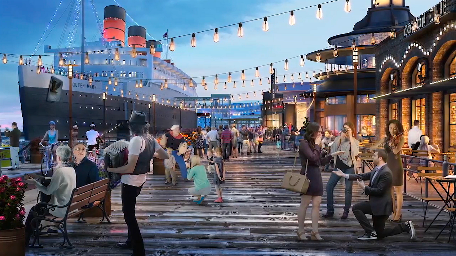 Visitors arriving at Queen Mary Island will be greeted with an extraordinary welcome designed to capture the sensations of a mainland to island transition. The team envisions several creative entry points by land, water and air, with a main lobby plaza off the freeway that will be reminiscent of a bygone era through distinct architectural and design details. From there, guests will stroll down the 2,400-foot long enchanting boardwalk past the marina, cafes and bars, eclectic retail shops and a 200-room hotel, all-encompassing nearly 700,000 square feet of retail space in total, until they reach the grand outdoor amphitheater.