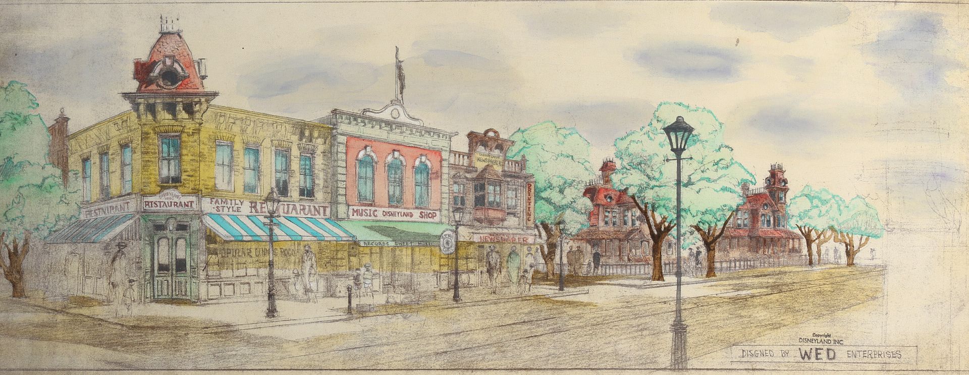 In the same catalog was also another artwork of an early concept done in 1953 by Dale Hennessy for Disneyland Main Street USA. The facade of the Newspaper office is the one on which Walt placed his father's name on... with a first concept for a Haunted Mansion too ( at the end of the street on the right )