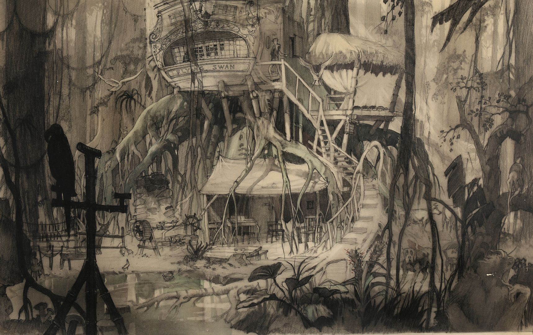 Here above is a very rare 1955 artwork for Disneyland Swiss Robinson Tree that i’ve found in a 2016 auction catalog of Profiles in History. In the auction description they said it was done "most certainly the work of Wolfgang Reitherman, one of the “Nine Old Men of Disney”, who was responsible for designing the Treehouse for the movie and the Disneyland attraction. The designs for the movie were also used to create the “Swiss Family Treehouse” attraction. Accomplished in graphite, pen and ink and gouache on artist board measuring 20 x 30 in" but i've checked with some friends Imagineers and they say that "the artwork looks more like one from Bruce Bushman than Reitherman, who did not work on the park or live action films". It's such a gorgeous descriptive and atmospheric piece anyway.