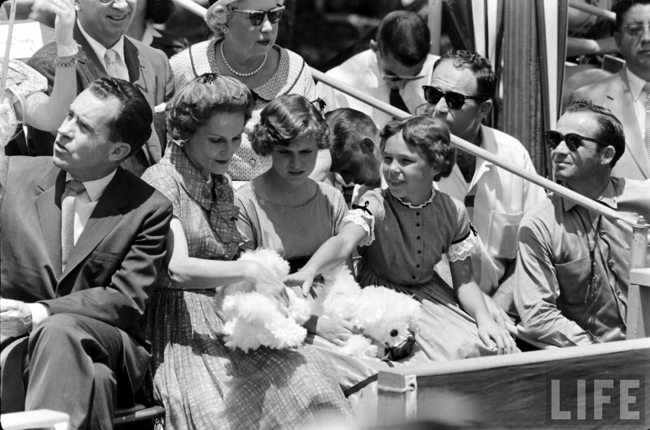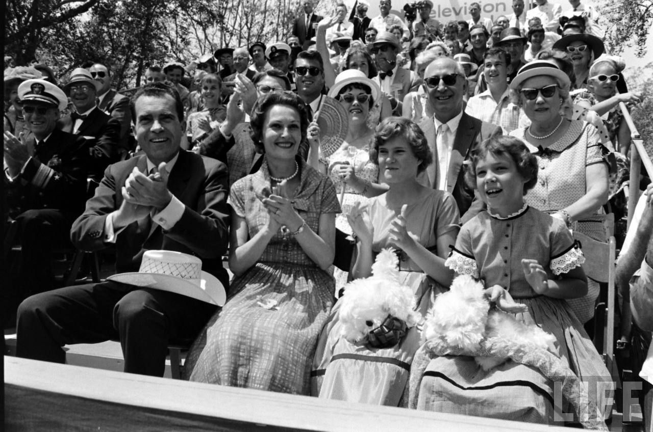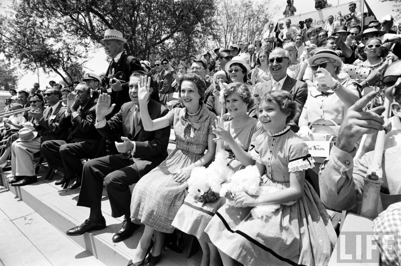 Below, the arrival backstage of Nixon with his wife Pat and their daughters Tricia and Julie, for the start of the vintage cars parade;