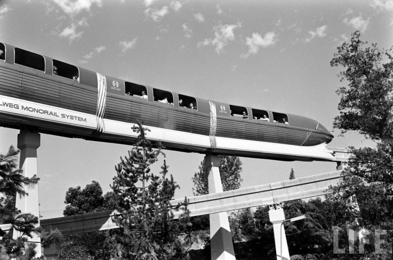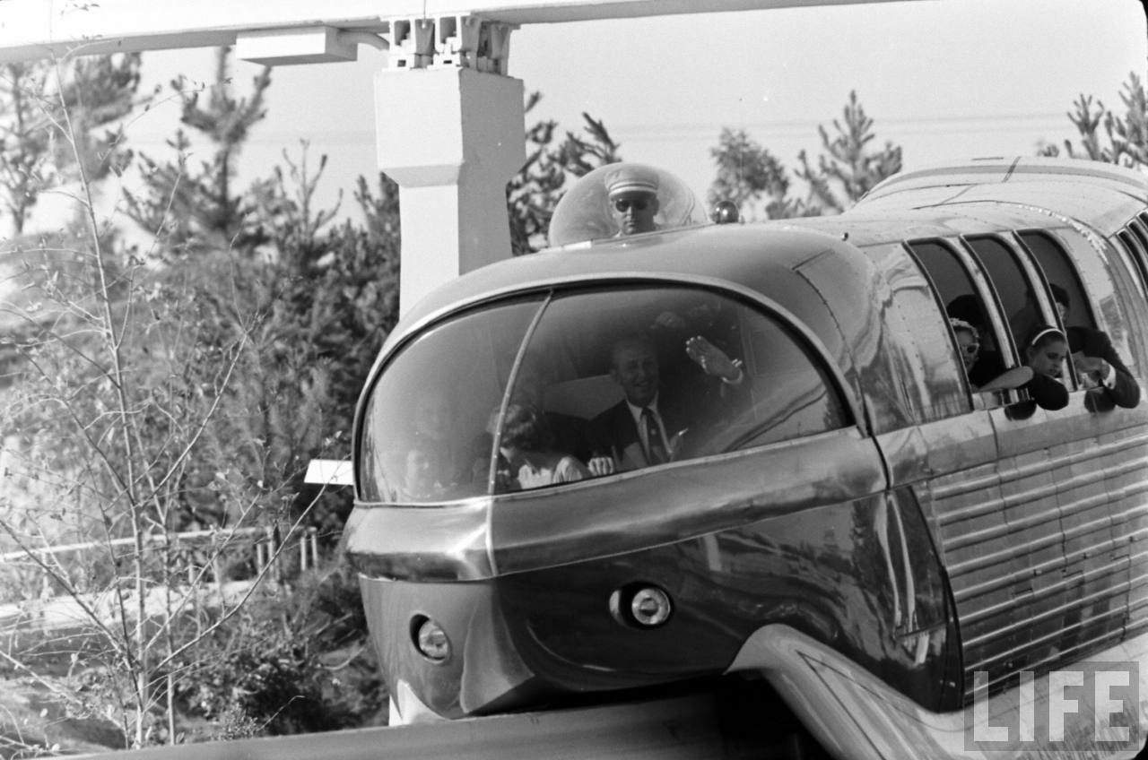 Here comes the Disneyland Monorail for his first official trip around Disneyland, but not outside or up to the Disneyland Hotel yet as the Monorail track expansion will come only in 1961.