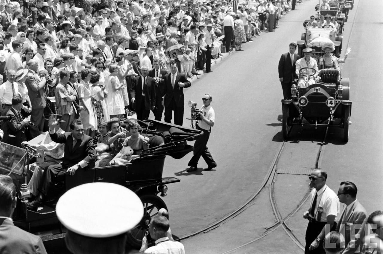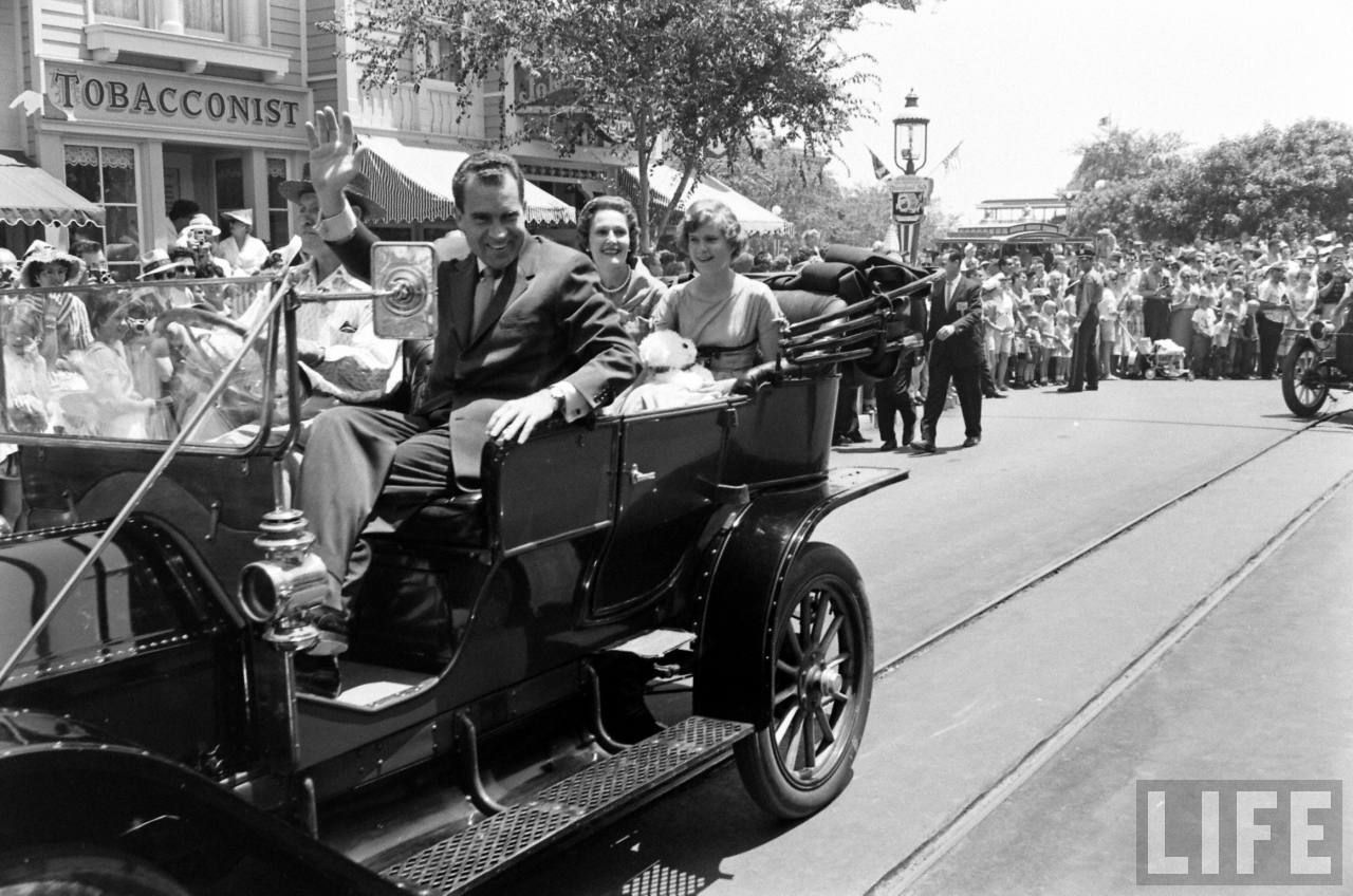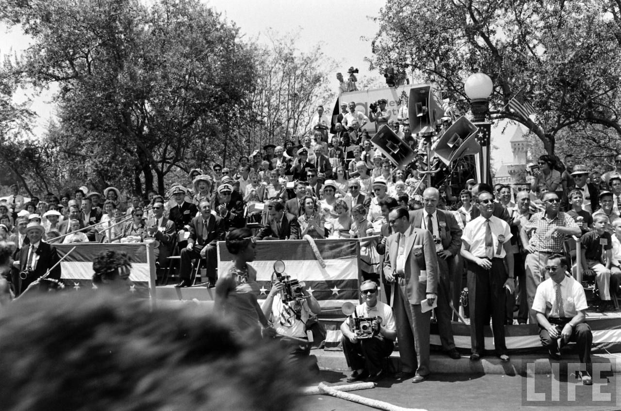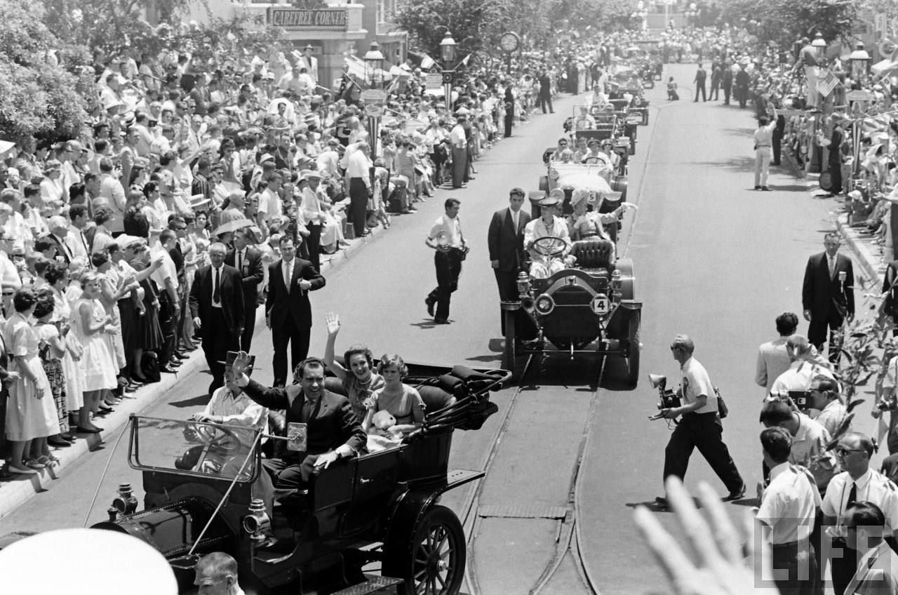 All-right, everyone is in place, after a little talk between Nixon and Walt, the 1959 Disneyland event parade can start!