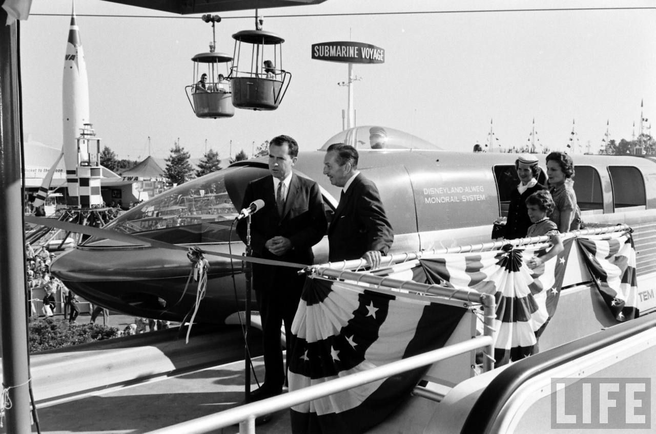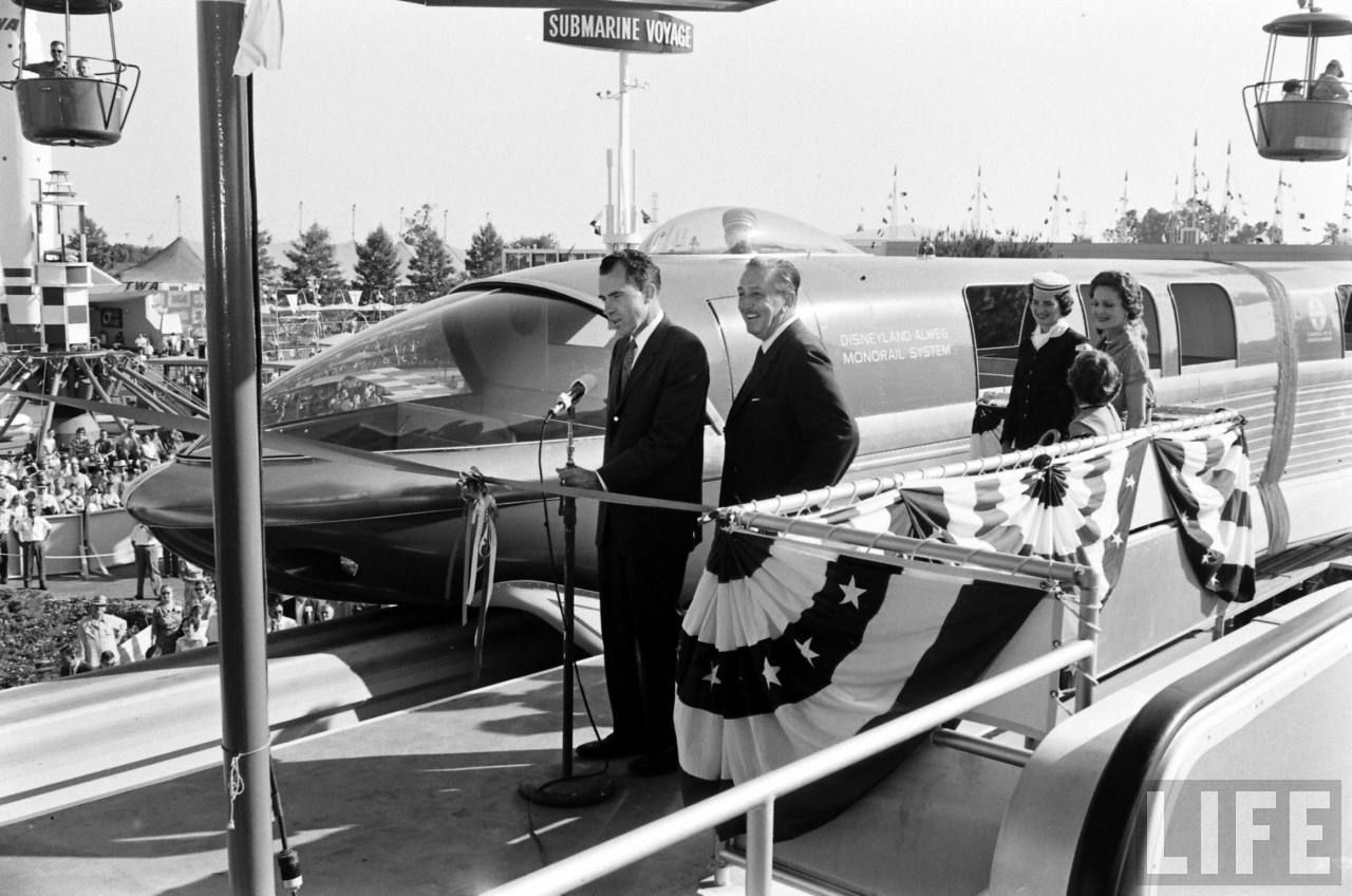 Yoi don'tknow it but those photographs also capture an incident that Disneyland Monorail designer/conductor Bob Gurr likes to tell, jesting about “kidnapping” Nixon, because his security men did not expect the monorail to leave the station yet! They were very upset being left behind on the loading platform! The story goes that Nixon was having so much fun about it, that they went around twice just to tease them more. Bob, who built the train was driving it, because it had never quite worked yet (having only gone around -once- without failing before!), he thought it was all just for photos, not an actual ride through that day, but Walt of course wanted to show off his new toys said, ‘let’s go’!