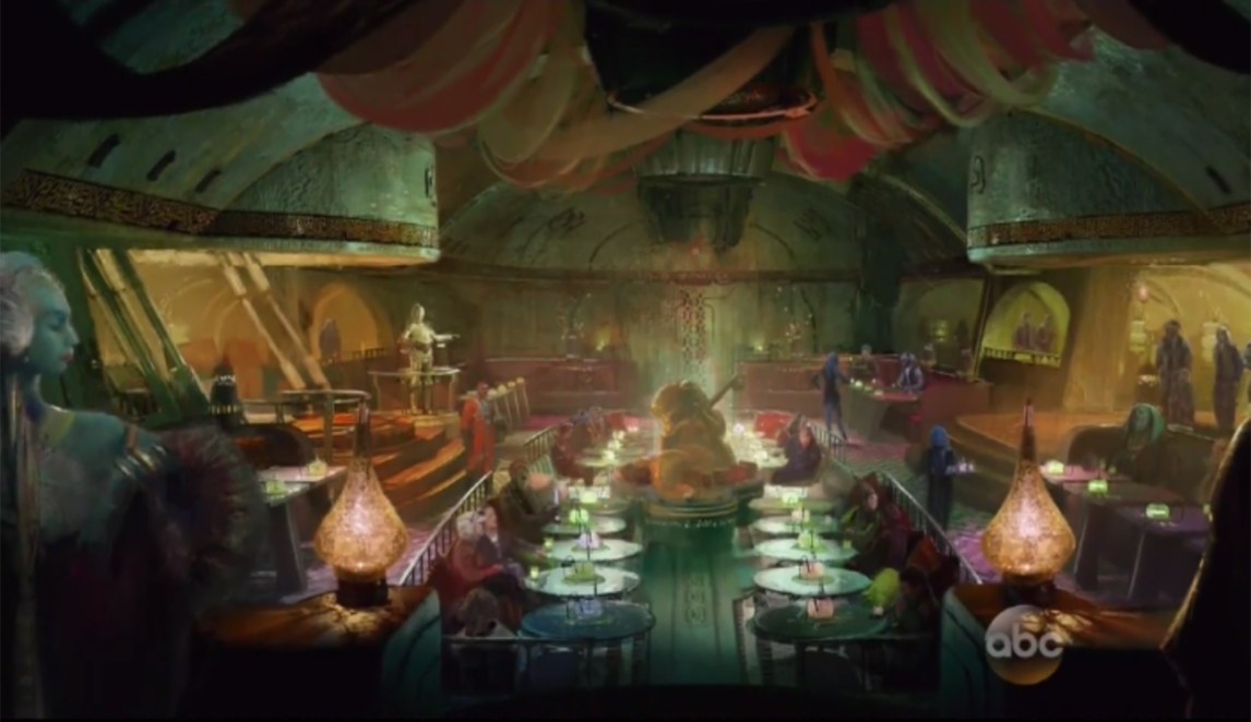 In addition, more Star Wars lands renderings were also shown during the Harrison Ford sequence, showing street markets, restaurants, the Cantina, and more decors of the awaited land!