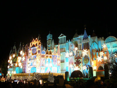It's a small world facade at night.
