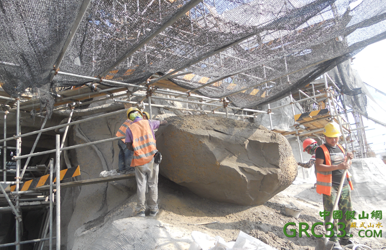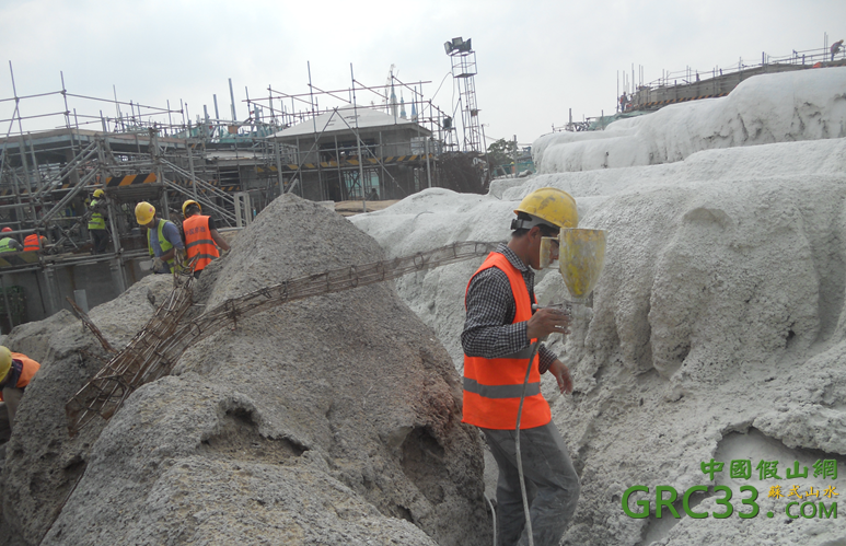 Now, we've seen previously plenty of pictures of the construction of Roaring Rapids mountain but the pictures below posted on a Chinese website are showing SDL workers working on the geysers section, the one you can see on the artwork above on the bottom left. You'll see also in the background on the pictures, on the right, the shape of the round load building.